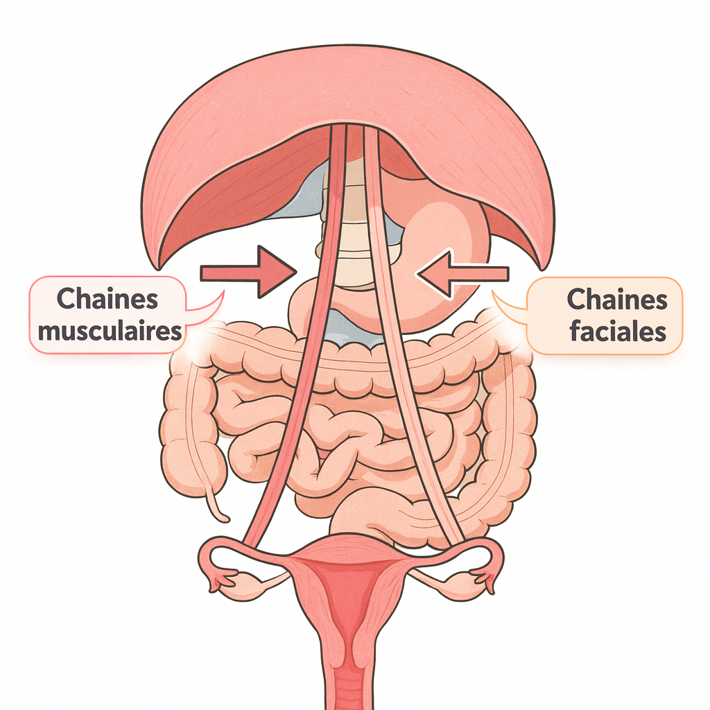 Pour améliorer ta compréhension : les chaînes musculaires et faciales sont des réseaux continus qui relient les muscles, les organes et les tissus du corps. Ces réseaux te permettent de comprendre pourquoi une tension au niveau du diaphragme ou qu’un stress émotionnel peut se transmettre jusqu’au bassin et à l’utérus.